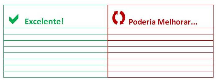 E se agora depois de analisar você pudesse escrever em uma coluna quais processos e procedimentos você considera excelentes e na outra coluna quais você mudaria algo na forma de fazer, qual das duas colunas sairá ganhando?